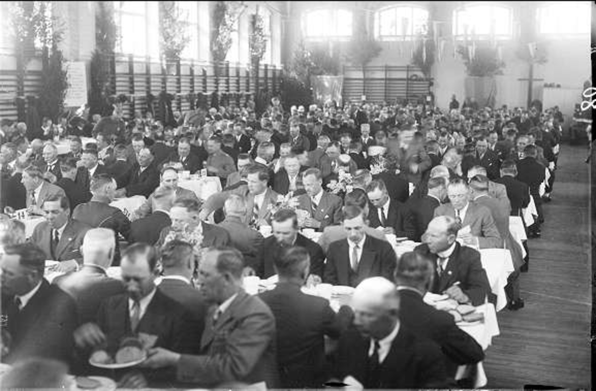 Kamratmåltid i gymnastiksalen - senare ombyggd till Lundasalen.