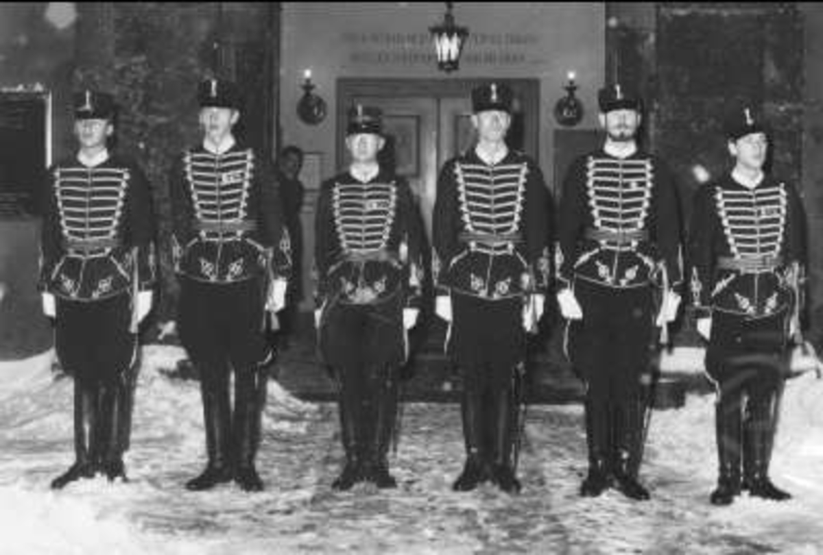 Standarförare och standarvakt utanför Sankta Elins kyrka i Skövde