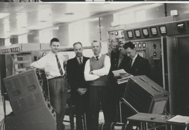 Kråks radiostation Karlsborg 1964. Intrimmning och prov av 20 KW KV-sändare, K 21, 22, 24. Från vänster: Bengt Dagås, Uno Nyström, K-H Loggert, Erik Eriksson, Robert Almqvist.