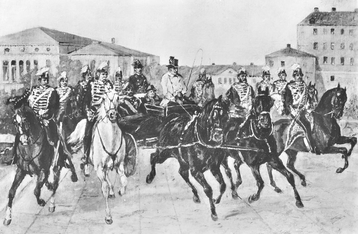 Tavlan föreställer konung Carl XV vid Engelbrektsstatyns avtäckande i Örebro 1865 åkande över storbron, eskorterad av officerare vid Kungl lifregementets husarcorps, K3, (org A J Arsenius 1889). Konungen åker tillsammans med landshövding frih J C Åkerhielm. Officerarna lära vara från vänster till höger: LJ C J Lewenhaupt, G V Düben, ryttm Nils Fock, G Lagerhjelm, löjtn A Ahnström, ryttm H Holst, löjtn C V Schultzen, Heim, A Taam samt ryttm E PH Ehrencrona. I fonden husarkasernen.