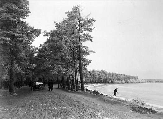 Strandvägen omkr 1900-talet. Här pågår isupptagning, is transporterades till olika platser på järnvägsvagnar. Se bilaga till 51736. Neg finns. Foto: Axel Sjöberg.