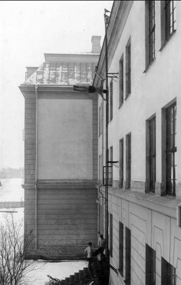 Furir Lundgren senare landsfiskal i Götene, urstark akrobat; här utliggning i brandstege. Gjorde sig känd bland annat genom att gå baklänges mellan Götene och Skövde.