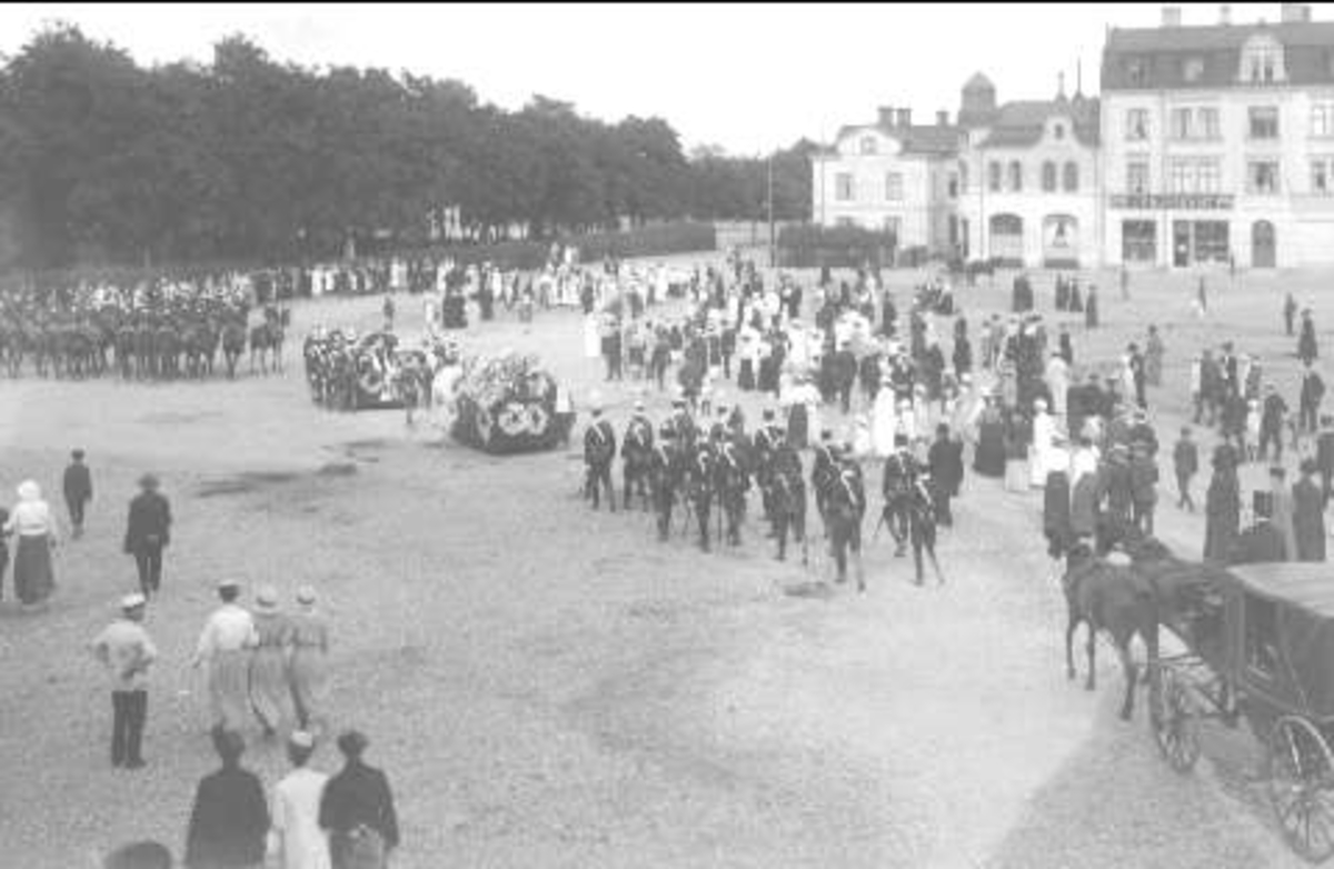 Löjtnant Charles William Dicksons begravning 12 augusti 1916. Begravningsföljet har nått Sandtorget, beredda att gå in på Sankt Sigfrids kyrkogård.