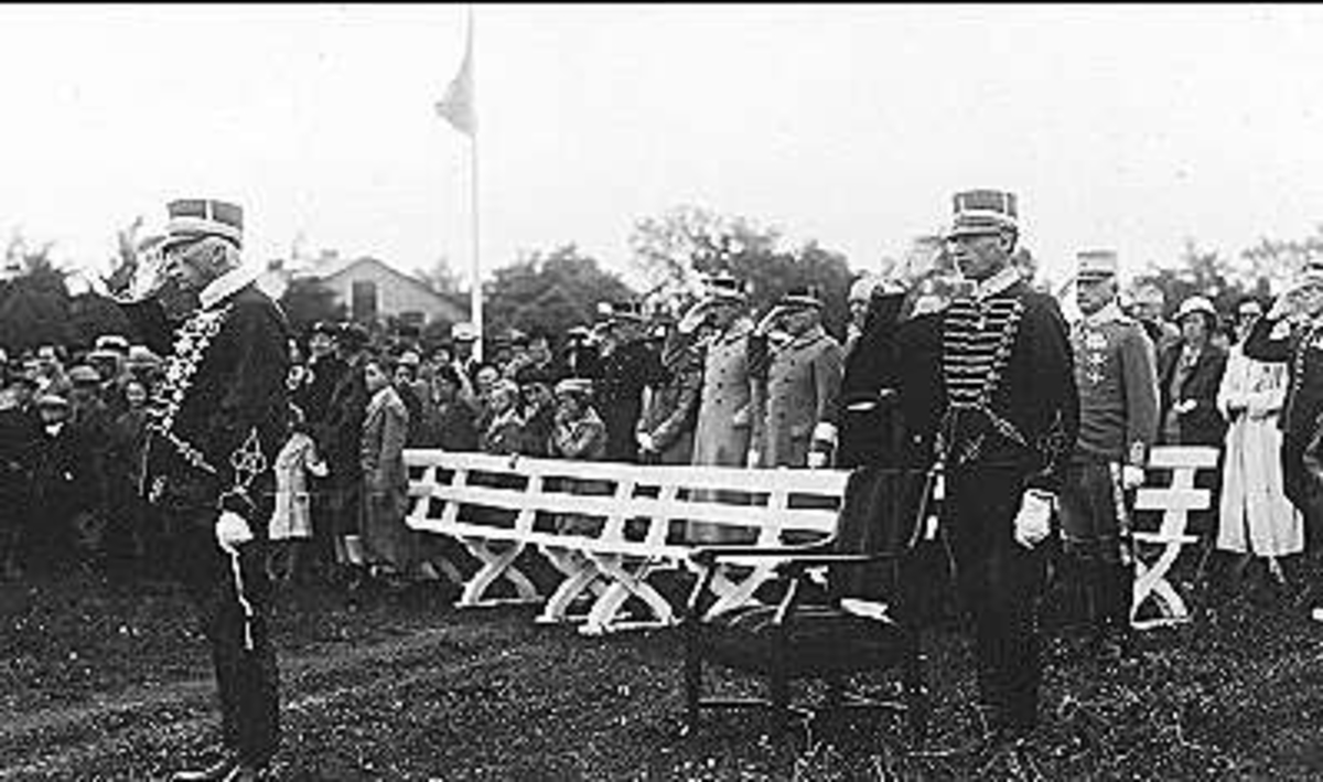 Kamratföreningsmöte, uppställning på fältet söder om K 3 kasern, Skövde, 1930-tal. Prins Eugen och major H Lagercrantz, Skövde närvarande.