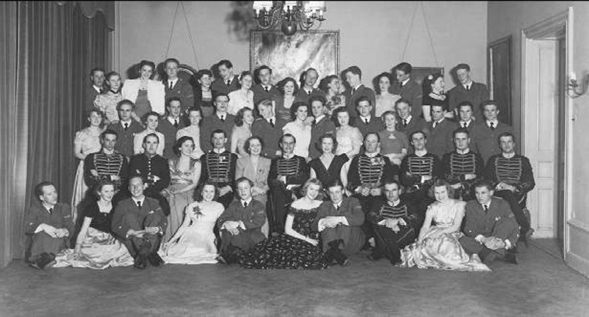 1933 - 1951. Kadettbal för vinterkursen 1948-49 på K 3 officersmäss i Skövde. 2 raden från vänster: Magnus Fomell, Hans Runstedt (intendent), Barbro Strandman, Sven Littorin, Gösta Bergensråhle, Börje Wallberg, W Hamilton, Måns Alexandersson. I främre raden i m/ä C-G Strandman.
