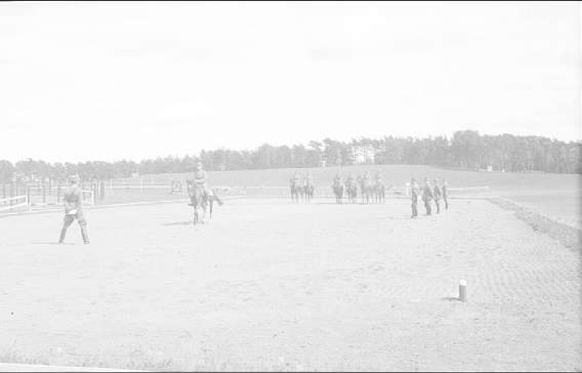 Kavalleriinspektör general G Gyllenstiernas inspektion av dressyrridning på dressyrbanan öster ridhuset. I bakgrunden Dunkehallshöjden.
