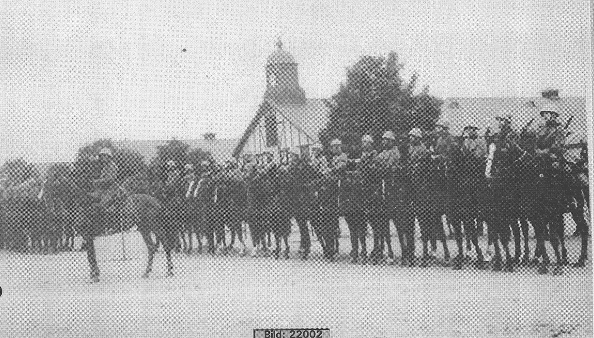 K3. Uppställning på kaserngården söder skvadronsstallarna för avlämning före avmarsch till övning.