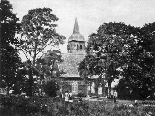 Undenäs, exteriör av gamla kyrkan, den brann ned år 1890. Till höger Frans Stråle av Sjöared, till vänster författare Torsten Fogelqvist och i mitten prosten Heléns döttrar.