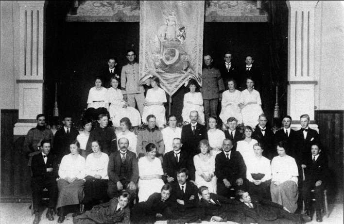 Karlsborg. Godtemplarlokalen (teaterbio), sammankomst med civila och militärer omkr 1920. Neg finns.