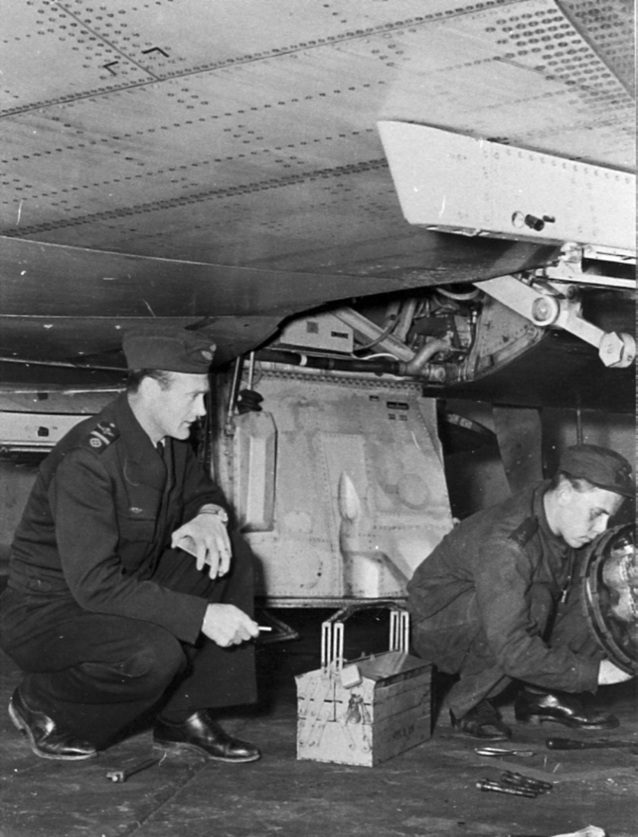 F6 Karlsborg 1957. Flygplanmästare Djurberg kontrollerar ett bromsbyte på flygplan A32 "Lansen".