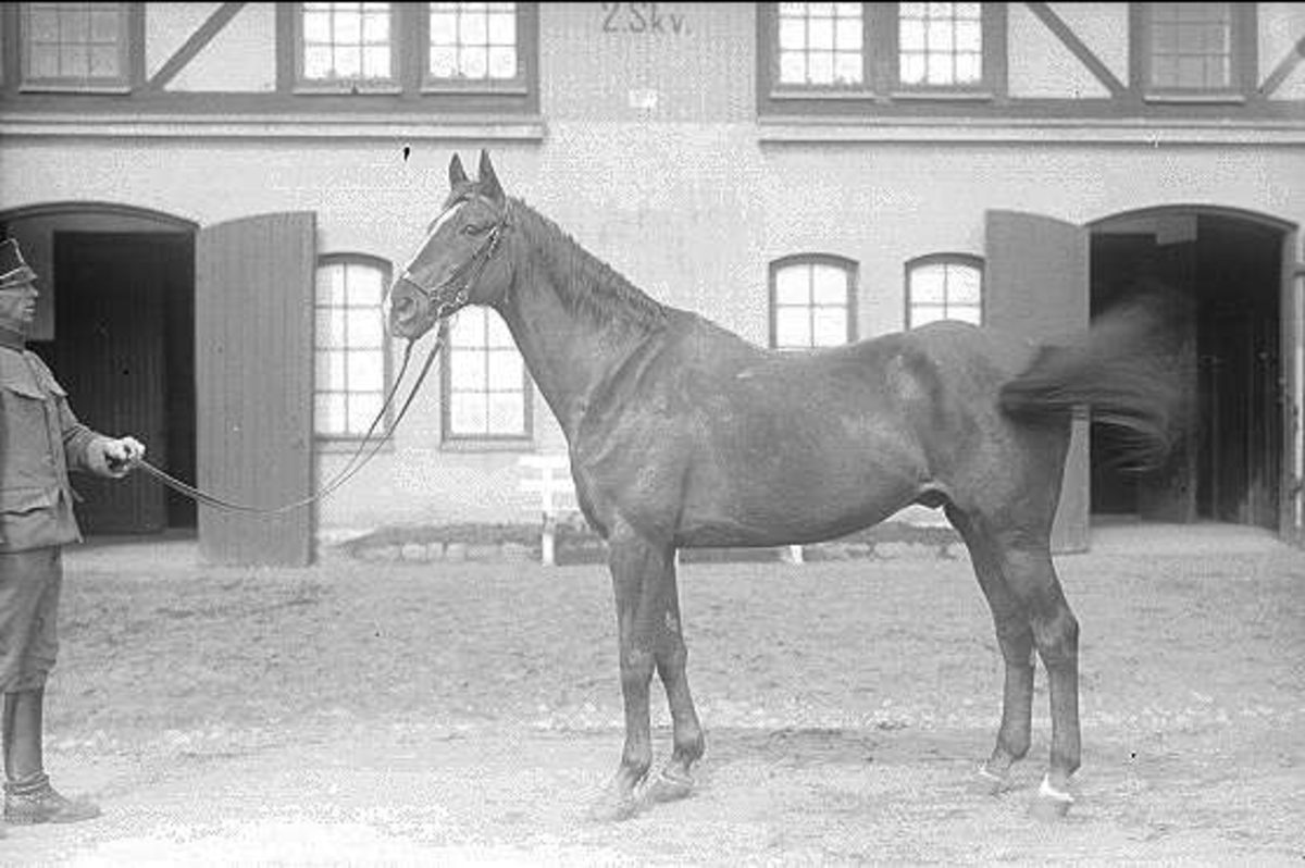 Livhusar med tilldelad stamhäst ur 4.skvadronen utanför skvadronstallet.