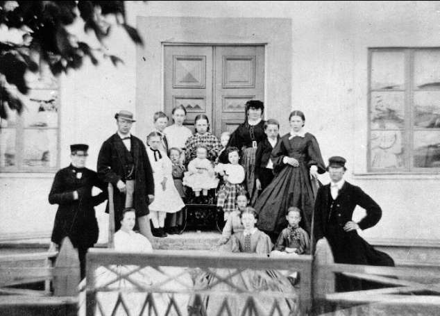 Palmqvists hus. Församlade på trappan bl.a. 2:a från vänster P.A. Palmqvist, längst bak i hatt fru Palmqvist. Barnet som sitter i mitten på stolen är Anna Palmqvist, Torsten Sandelins mor, född 1863. Kortet tillhör Karl-Axel Hanssons album.