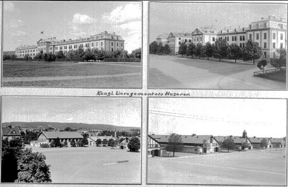 Fotomontage för vykort av kasernbyggnaden (de två övre fotona) gymnastiksalen (det nedre vänstra fotot) och de fem stallarna (det nedre högra fotot).