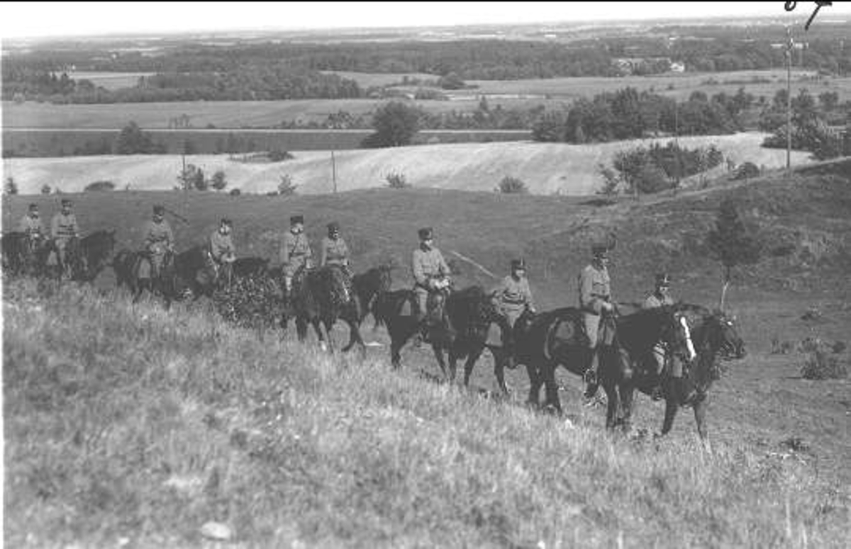 Del av regementet på marsch mot Hene skjutfält för att åse förevisningsskjutningar med 8,1 cm granatkastartropp. Ledare förevisningsövningarna: löjtn. Sven Littorin. Granatkastartroppchef: serg. Ragnar Seipel.