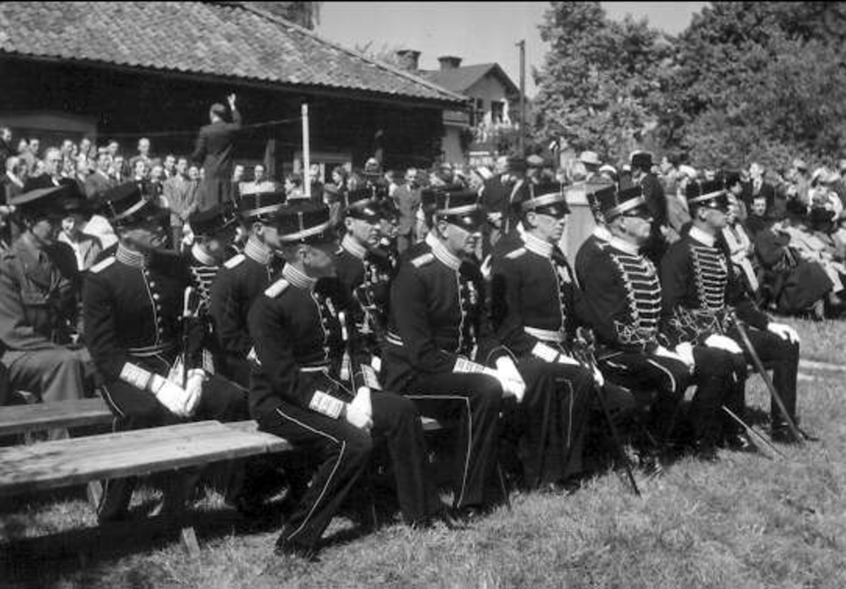 Livskv minnessten vid Fellingsbro avtäckes. I främre raden från vänster: Major Afzelius, major H Ling-Vannerus, överste E Flodström, överste G Bergenstråhle och major Littorin.