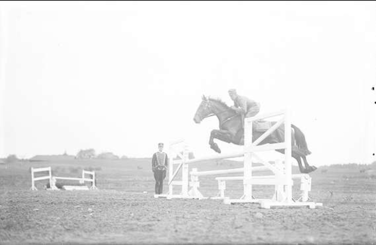 Titel: Banhoppning på fältet söder K 3 kasern off.asp i m/23, vpl i m/1895. De gamla uniformerna användes långt efter det att ny modell fastställts. Modell 1895 användes ända fram till 1940-talet. (exempelvis en volontärskola 1941 på K 2 i Hälsinborg.)