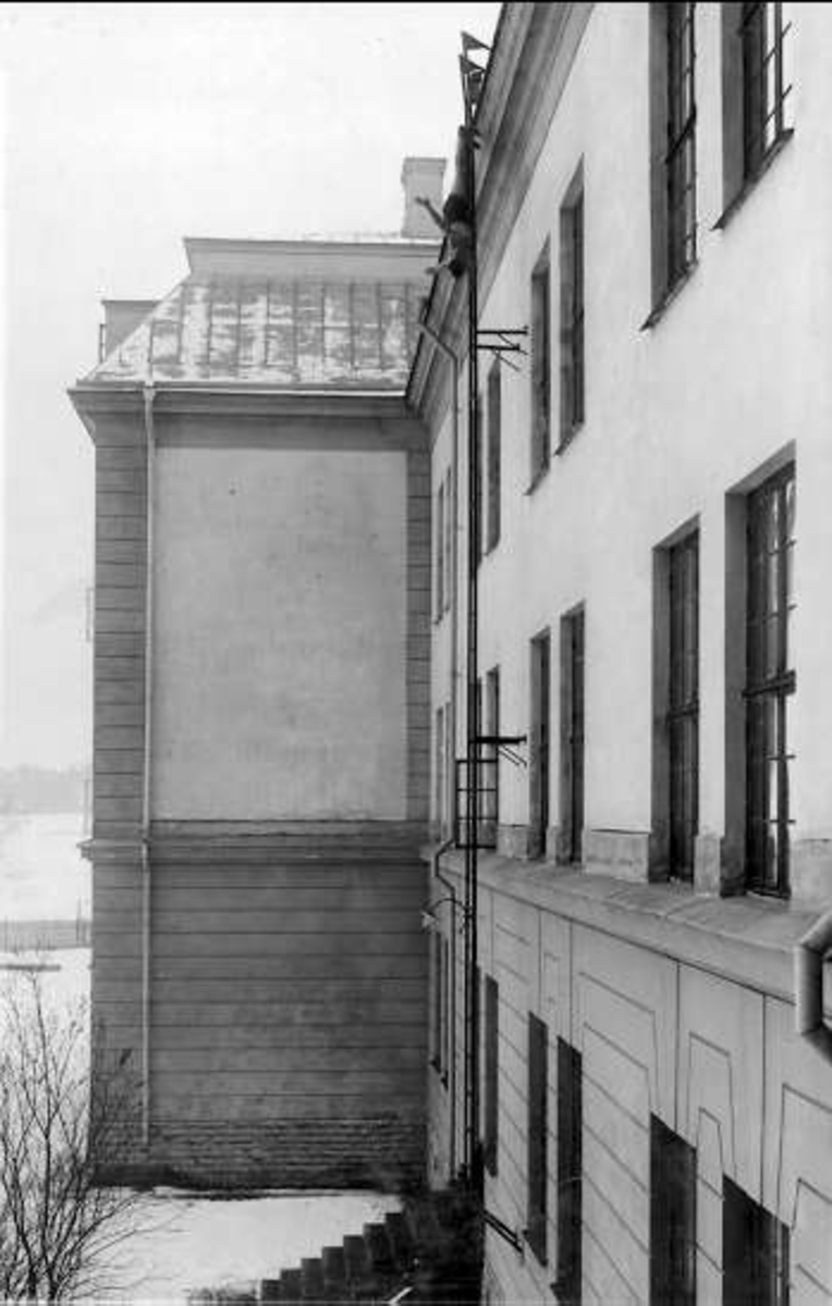 Furir Lundgren senare landsfiskal i Götene, urstark akrobat; här utliggning i brandstege. Gjorde sig känd bland annat genom att gå baklänges mellan Götene och Skövde.