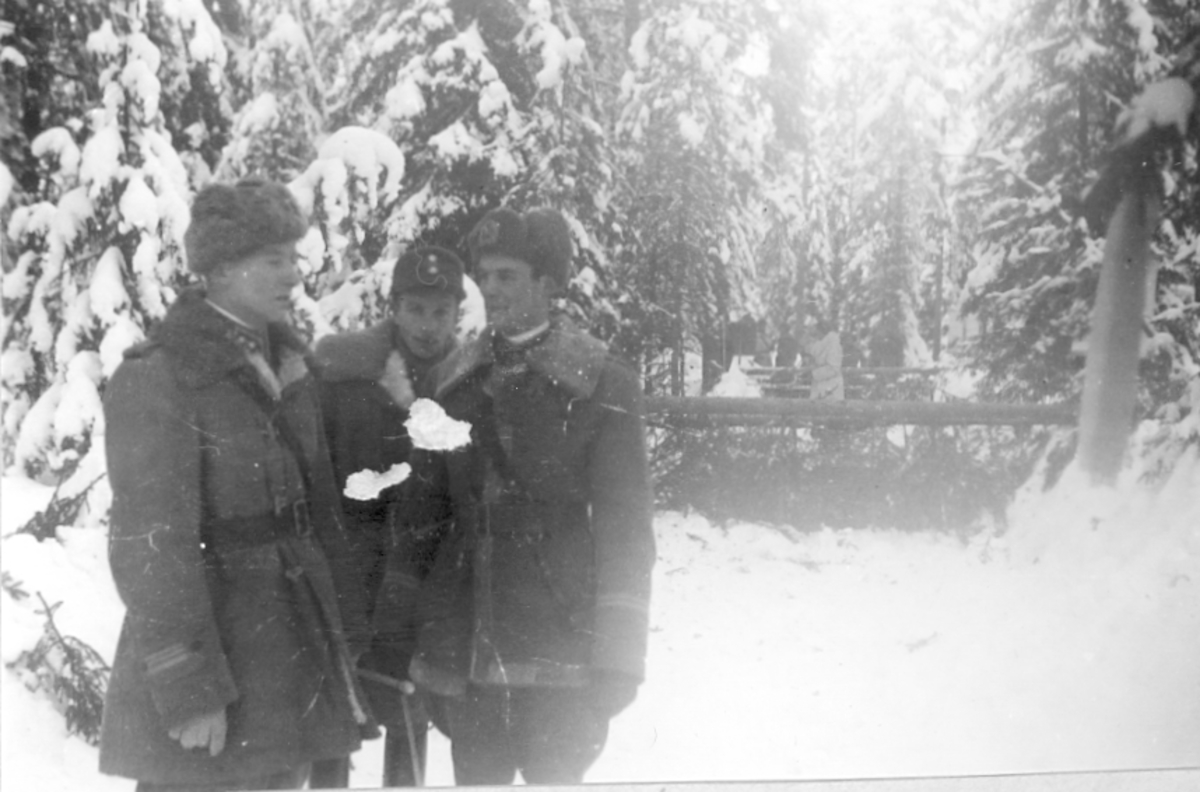 Ridkurs 12/10 1954-13/5 1955 Strömsholm.Övningar och tävlingar i Boden.Överfurir Hjertstedt samtalar med de 2 finlänska deltagarna.Deltagare från Livregementets husarer, K3:Fänrik Westergren, överfurir Fridolfsson och sergeant Ewert Olausson.Förteckning över övriga deltagare finns i albumet.Chef för ridskolan:Överstelöjtnant Gustav Nyblaeus.Förteckning över övriga lärare finns i albumet.Albumet är en donation från Ewert Olausson.