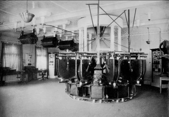 Interiörbild, Karlsborgs radiostation i Kråk. Gnistsändaren, den största som byggts, fanns på Kråk 1917 - 1932. Sändaren var från 1926 - 1932 reserv för Motala rundradio. Den revs för att bli visningsobjekt på telemuseum i Stockholm.