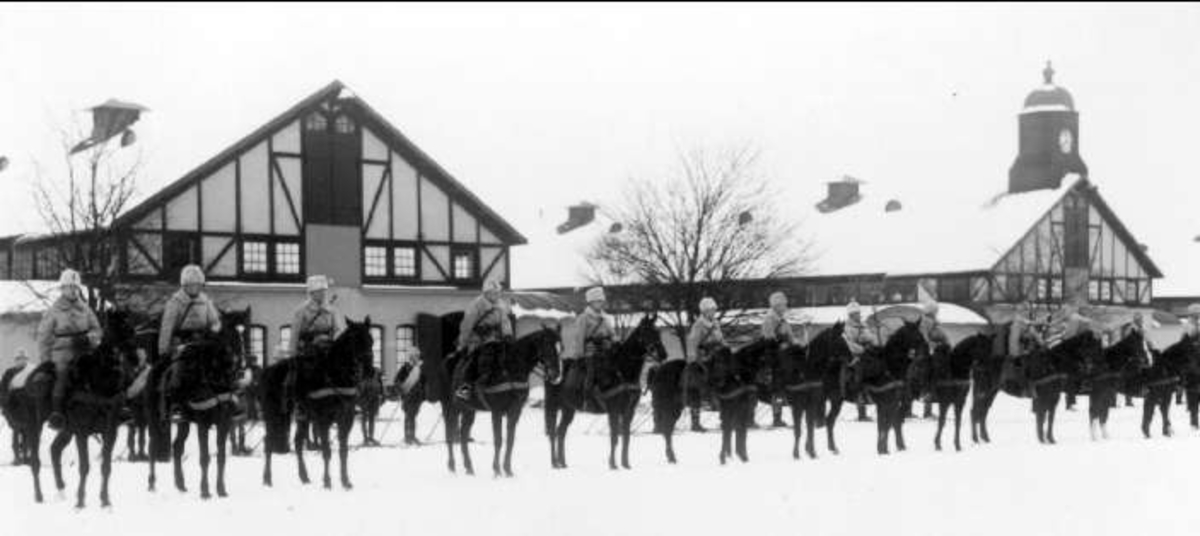 Livskvadronen, K 3 vinterorganiserad. Hästarna med tolkselar och tolklinor, en tredjedel av skvadronen klara för tolkning, två husarer bakom varje häst.