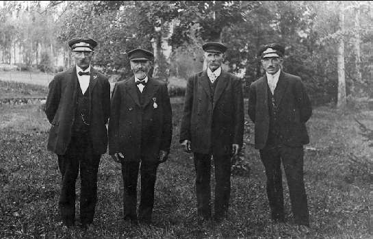 Forsvik 1922, brovakter vid Göta kanal, Calle Almqvist, Alexander Grahn, Victor Andersson i Brosundet, Valle Lindström Rödesund. Medaljutdelning till Alexander Grahn och Victor Andersson (Broningen), men Victor Andersson vägrade att ta emot medaljen. Neg finns.