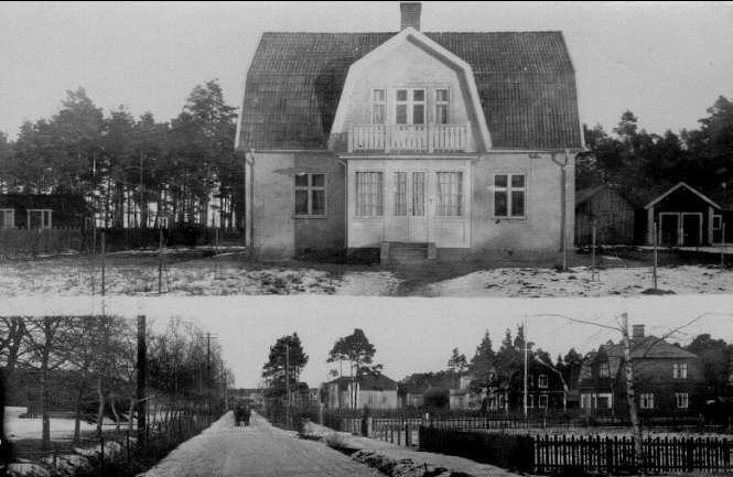 Karlsborg, Storgatan. Övre byggnaden är byggt år 1924 och finns fortfarande kvar. Nedre bildens byggnader är rivna. Fotot är taget omkr 1930. Kortet finns ej på museet.