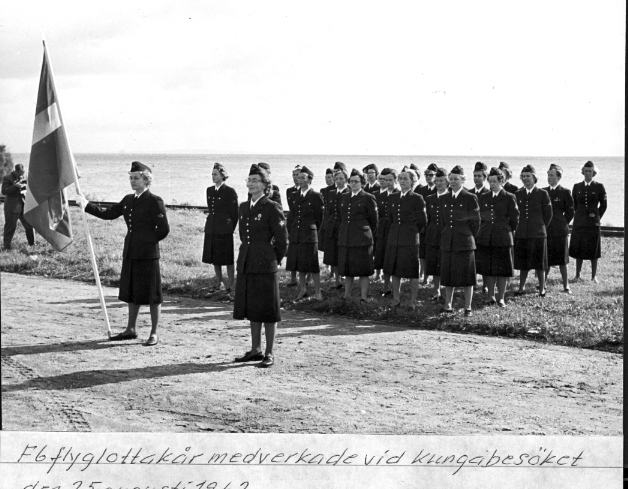 F6 Flyglottakår vid kungabesök 25/2 1962. Fanvakt: Marie-Louise Bruzell (Tejler), intill henne Ulla Ströstrand. Albumet är en del av en donation från Karl-Axel Hansson, Karlsborg. Förteckning över hela donationen finns i albumet samt som Word-dokument.