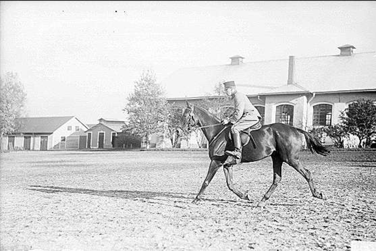 Livhusar (hästskötare) på officers tjänstehäst utanför ridhuset.