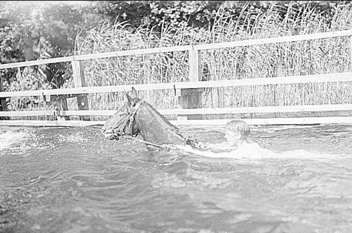 Vid bryggan i Sjötorpssjön tränades först svämning av hästar - hästen simmade och ryttaren ledde den gående på bryggan - därefter simning med häst längs bryggan. Därefter var det klart för simning med häst ute i sjön.