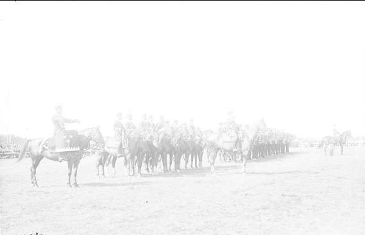 Titel: Kadrilj vid SFK:s vårtävlingar 1933 under ledning av löjtn. Sven Littorin. Deltagare musikkåren under musikfanj. C A Borgmans ledning samt 16 underbefäl vid regementet. Bilderna tagna delvis på kaserngården och delvis på prishoppningsbanan.