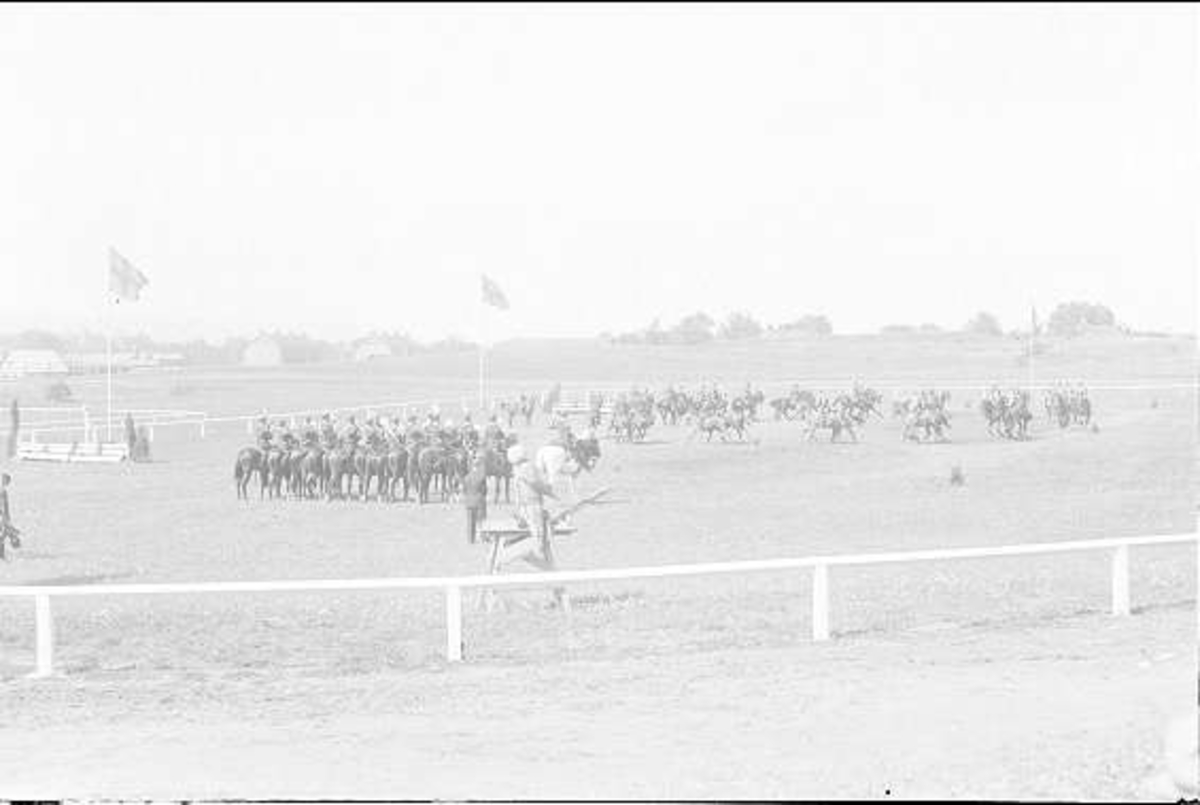 Titel: Kadrilj vid SFK:s vårtävlingar 1934 under ledning av löjtn. C J Wachtmeister. Deltagare musikkåren under musikfanj. C A Borgmans ledning samt 16 underbefäl vid regementet. Bilderna tagna delvis på kaserngården och delvis på prishoppningsbanan.
