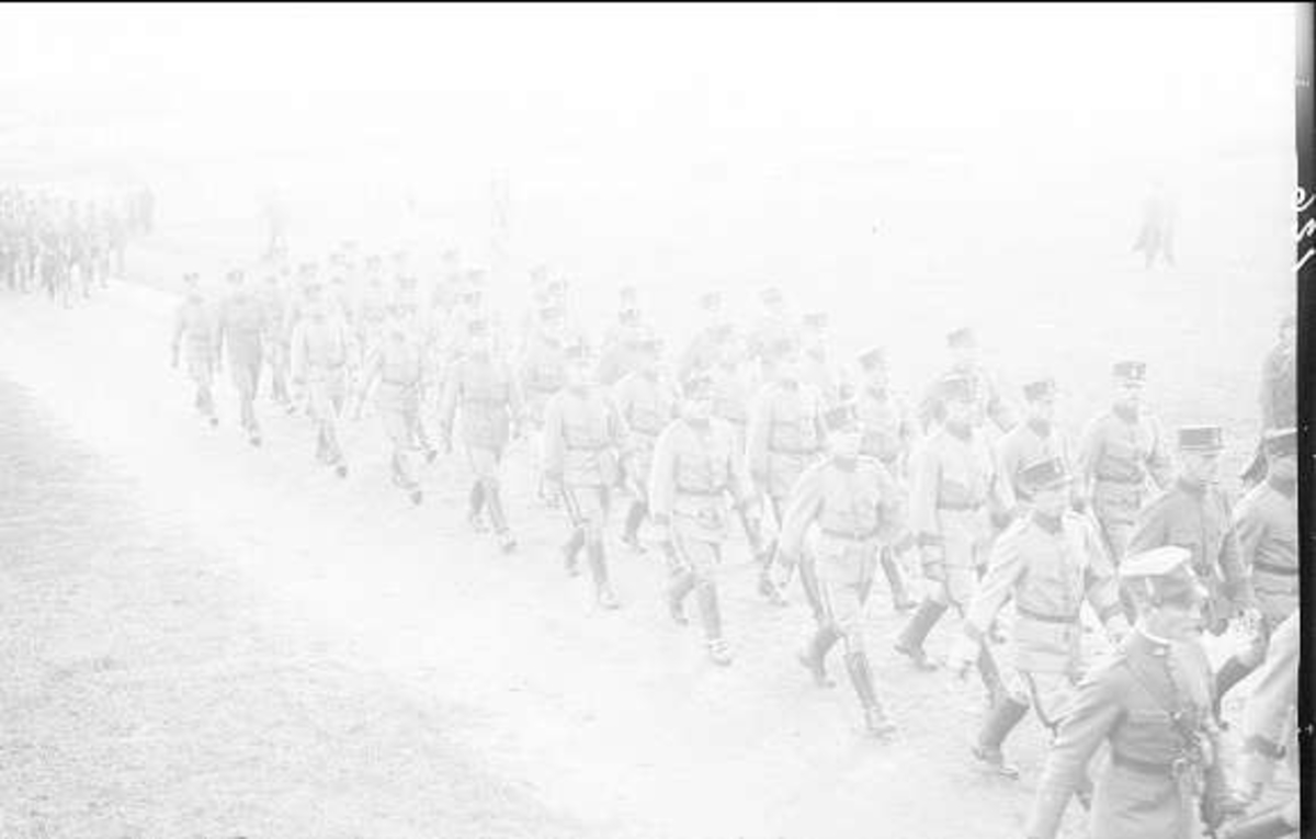 Titel: På marsch från kasern till fältgudstjänst i Dunkehall. Soldaterna iklädda uniform m/1910 och mössa m/ä.