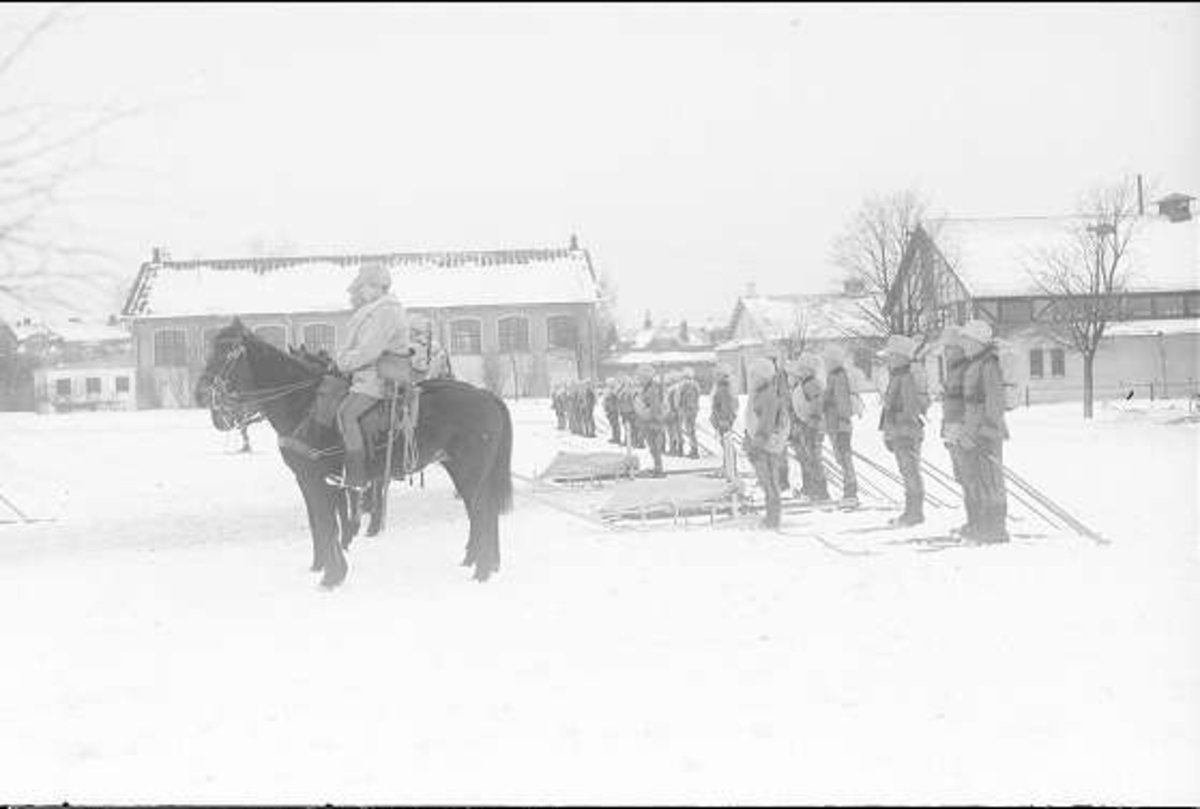 Titel: Ryttarpluton ur 4. skv vinterorganiserad. Plutonchefen på skidor, plutch stf. till häst. Två skidlöpare tolkar efter varje häst. Vissa hästar drar pulka med tunga vapen efter vilken en skidlöpare tolkade för att kunna styra pulkan och vid behov bromsa.
