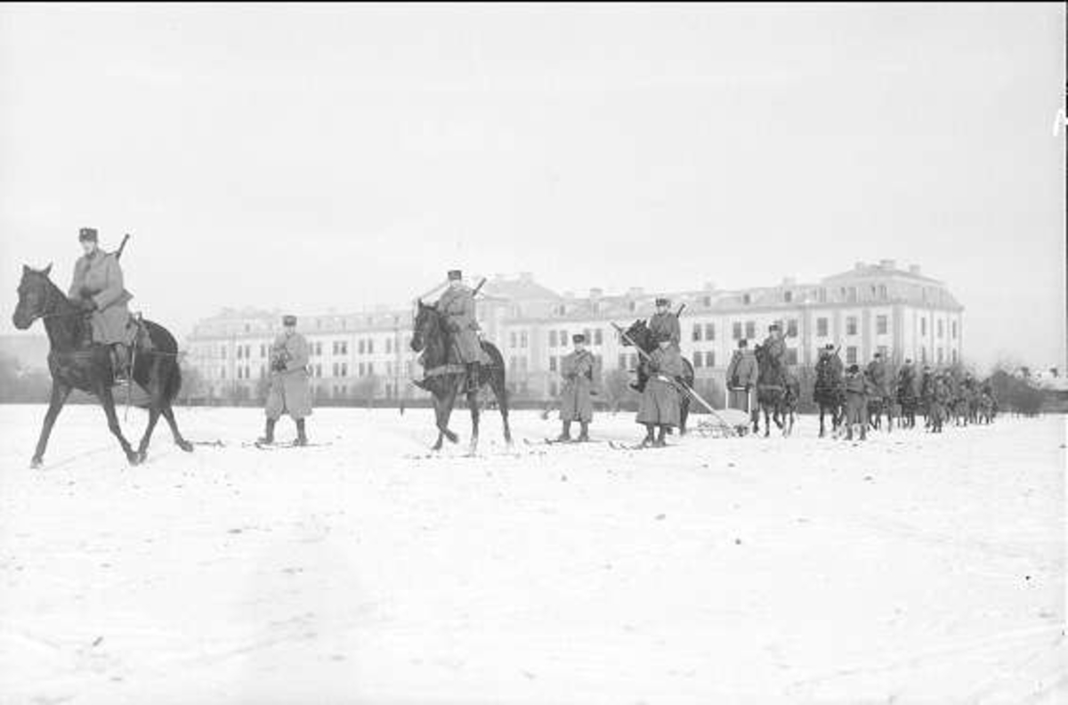Vinterutbildning med regementets stamskolor. Främst chefen ensam efter en tolkryttare, därefter två tolkande husarer efter varje tolkryttare. Efter vissa tolkryttare pulka eller kavallerikälke (här det senare), efter denna en man för styrning och bromsning.