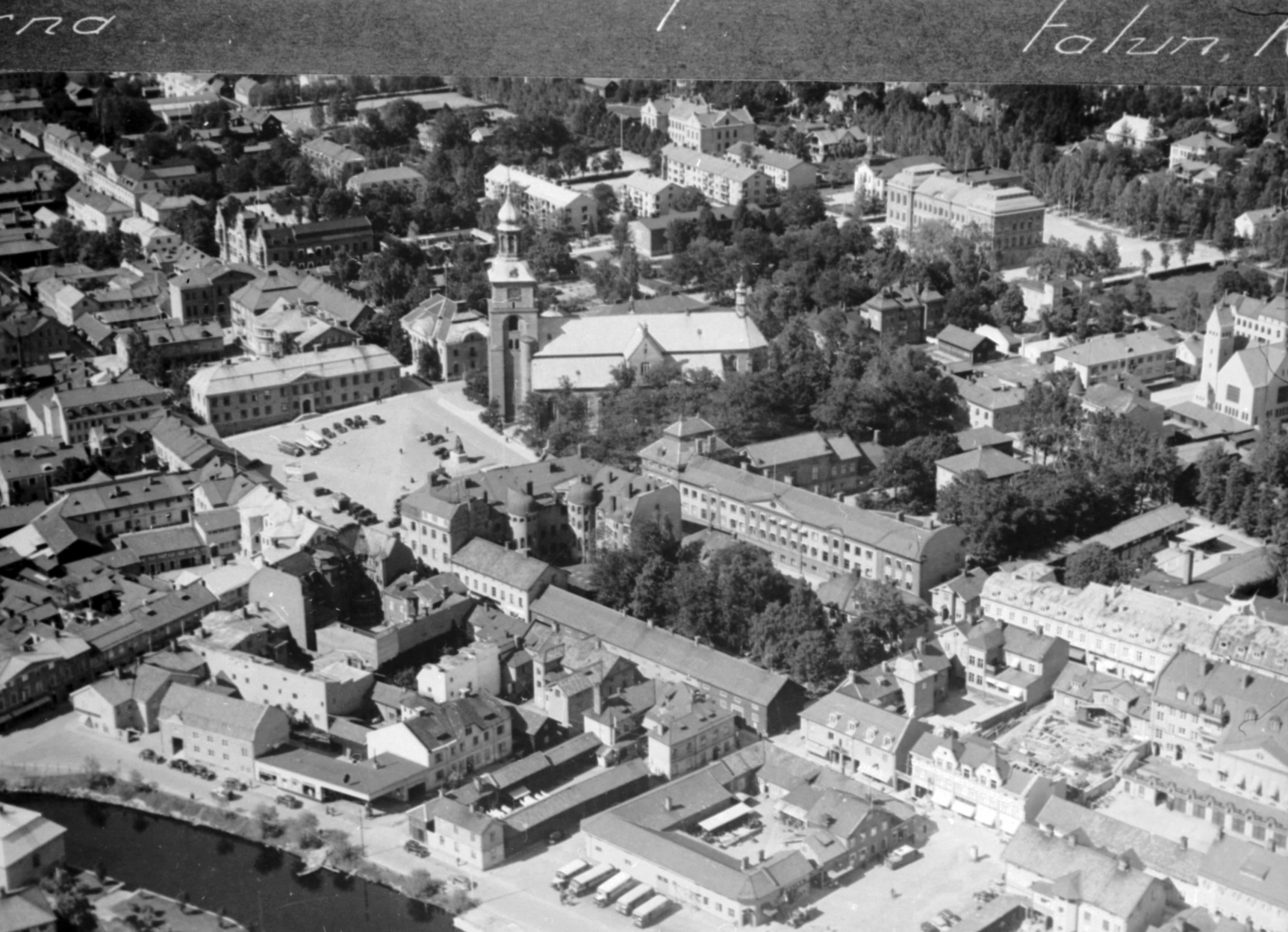 Flygbild över Falun med kyrkan i centrum, från söder.