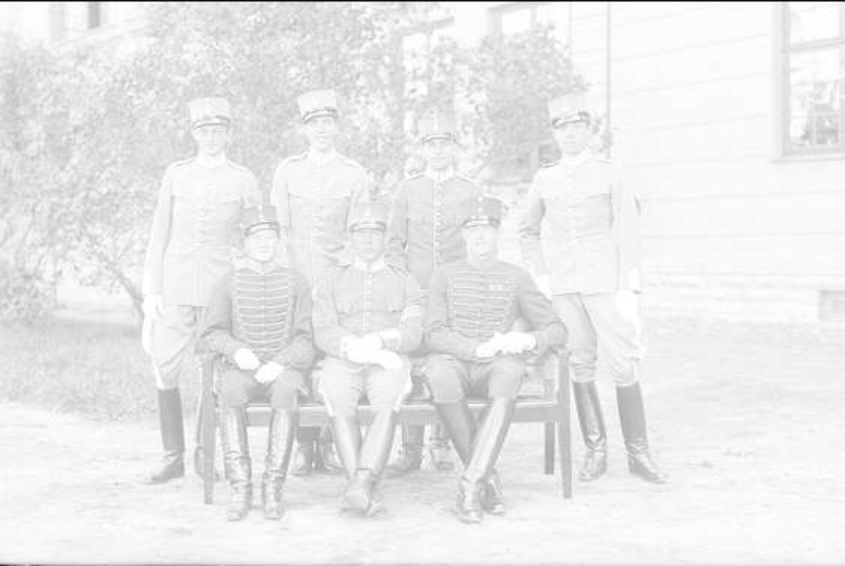 Underbefäl ur K 1 Stockholm, som genomgått armens underofficersskola. (Trestreckad furir) tillsammans med sex elever i uniform m/ä. Fyra elever (stående) från K 1 Stockholm och två elever (sittande) från K 2, Hälsingborg. Till vänster i bild aspirant D´Otrante. De ljusa K 1-uniformerna privat uppsydda. De mörka uniformerna kronans. Gruppbild.