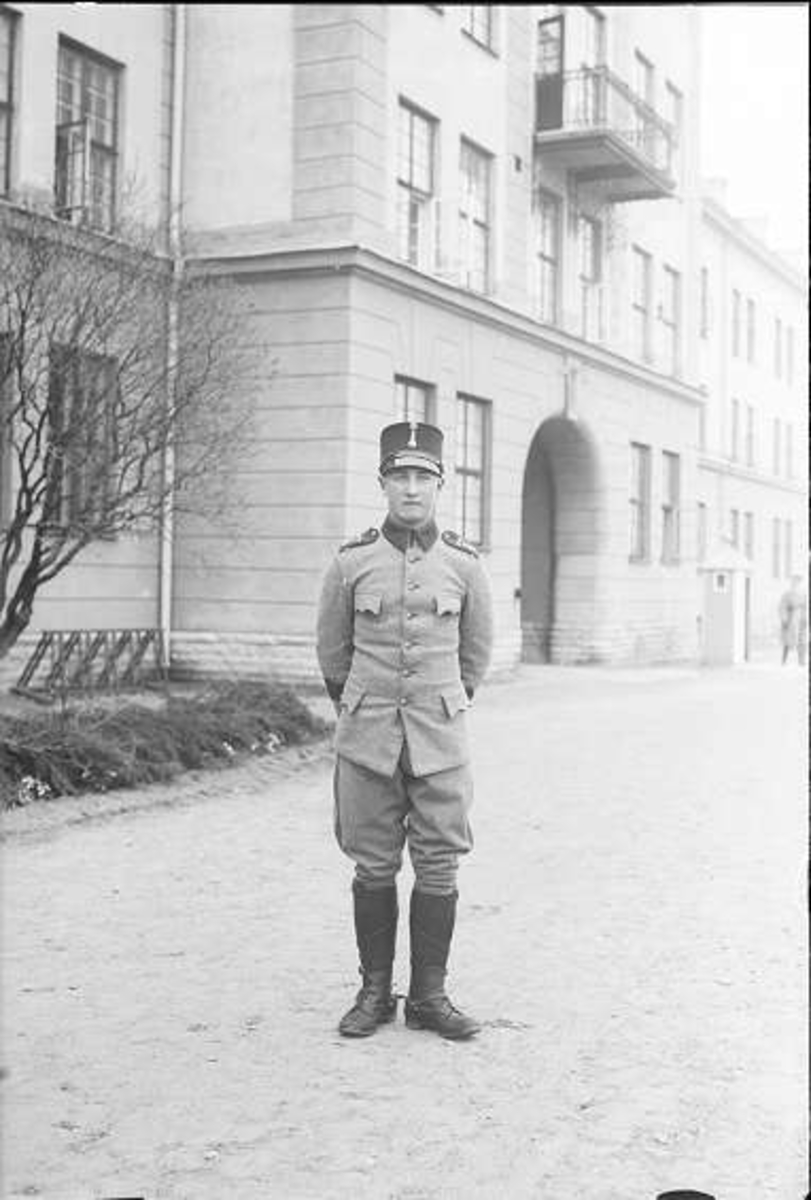 Livhusar i uniform m/1910, mössa m/1895 och benläder, utanför valvet vid K 3
