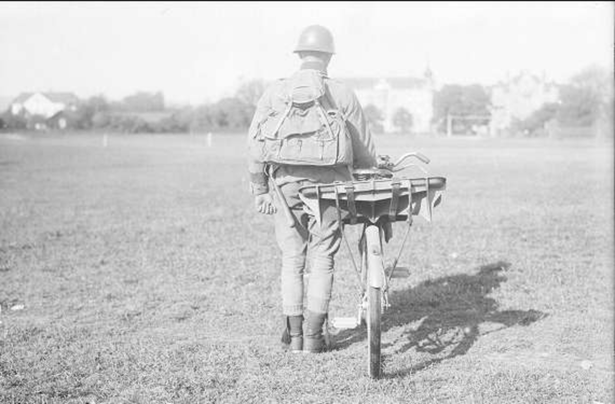 Husar tillhörande granatkastarpluton på fältet söder kasern fullt fältutrustad med granatkastarstödplatta på cykeln.