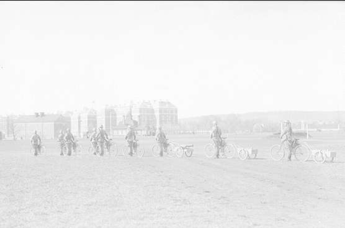 Försök med cykeltrupp. Tunga cykelgrupper med släpkärror för tung materiel.