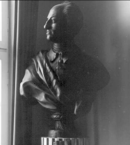 Karl XII - gipsavgjutning av bronsbyst på Stockholms slott, 92 cm hög byst på refflad pelare av trä.
