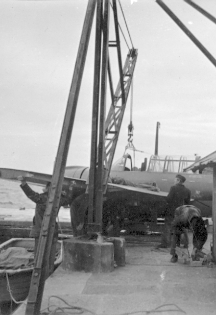 F6 Karlsborg 1945. Den 18/7 nödlandade B17 Röd David i Vättern pga. motorstörningar efter start. Föraren och signalisten klarade sig utan skador. Här upphissad vid stenbryggan. Albumet är en del av en donation från Karl-Axel Hansson, Karlsborg. Förteckning över hela donationen finns i albumet samt som Word-dokument.
