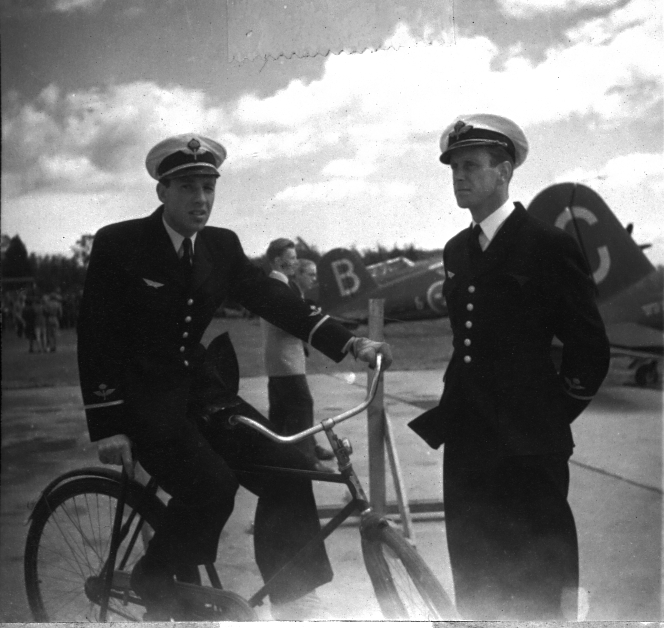 F6 Karlsborg 1945. Flygets dag. Fänrikarna från vänster Wallin och Heimer. Albumet är en del av en donation från Karl-Axel Hansson, Karlsborg. Förteckning över hela donationen finns i albumet samt som Word-dokument.