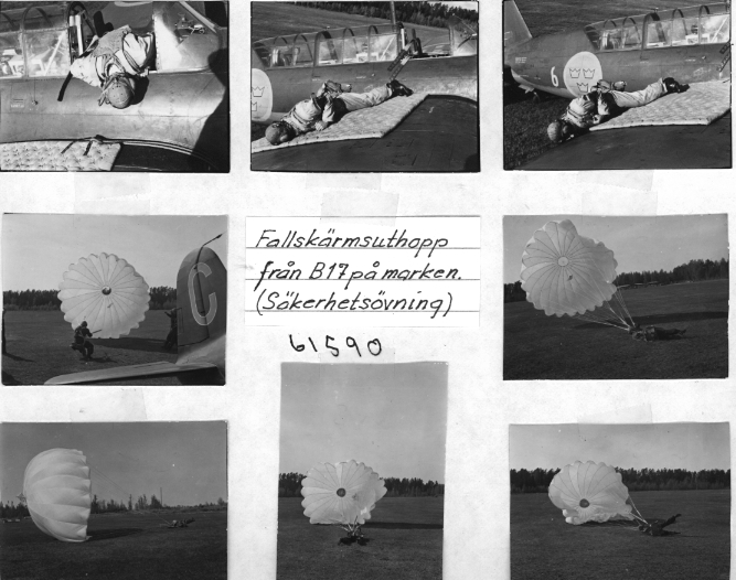 F6 Karlsborg 1947. Fallskärmshopp från B17 på marken (säkerhetsövning). Albumet är en del av en donation från Karl-Axel Hansson, Karlsborg. Förteckning över hela donationen finns i albumet samt som Word-dokument.