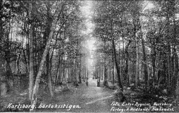 Karlsborg, Kärleksstigen, staketet till vänster var troligtvis ett skydd för den uppgrävda "Våta graven" eller "Blängen". Kortet är från K-A Hanssons album.