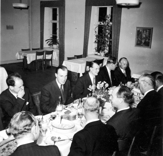 LV1 Karlsborg-volontärer inryckta 31/10 1933 firar 20-årsjubileum 31/10 1953. Hedersgäst: lärare stj. Ankarstedt. Albumet är en gåva från förvaltare Tage Södergren.