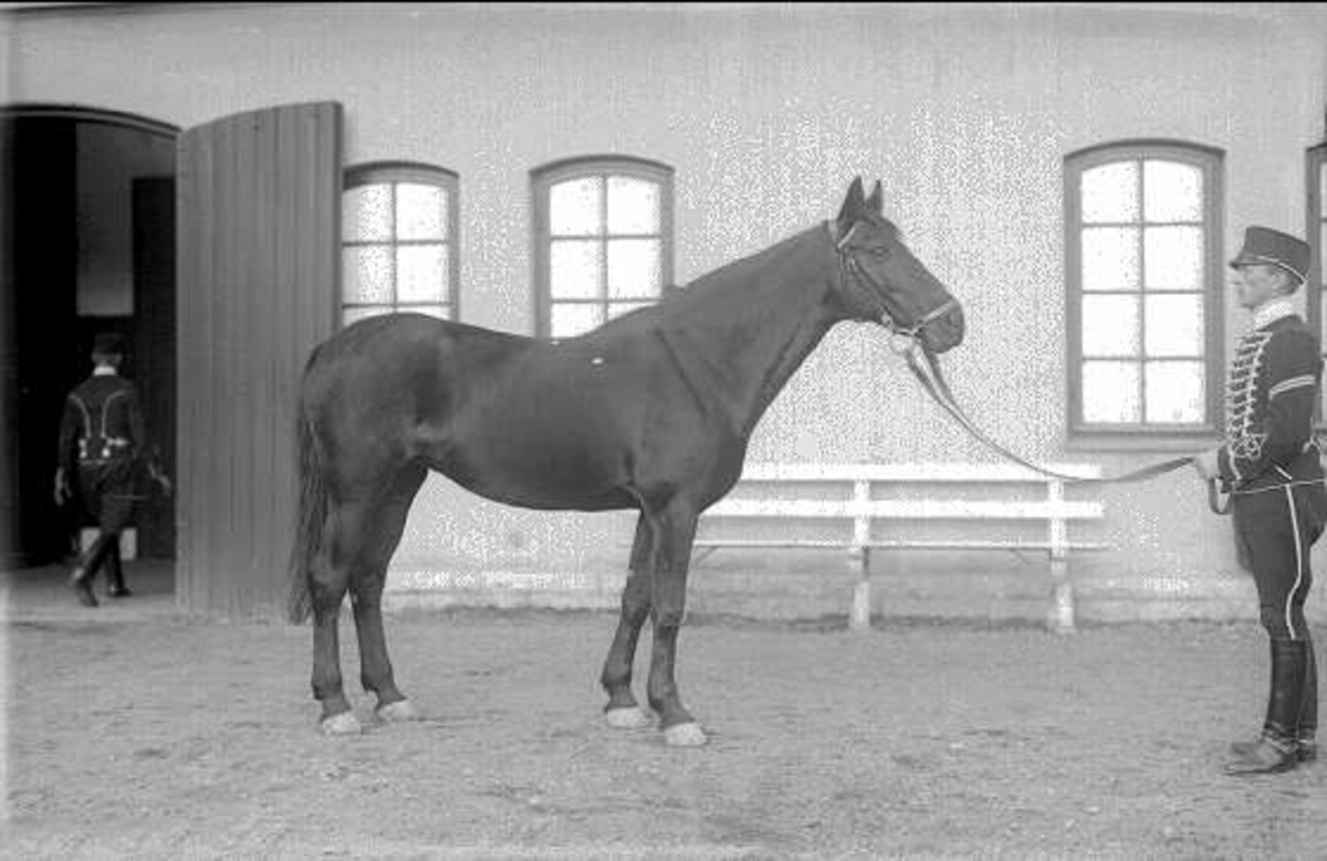 Livhusar med tilldelad stamhäst ur 2.skvadron framför skvadronens stall.