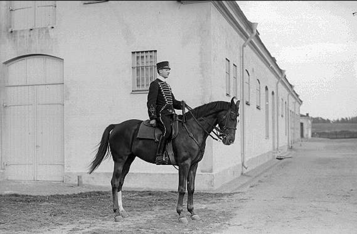 Livhusar med tilldelad stamhäst utanför vapenförrådet (i norra kasernområdet).