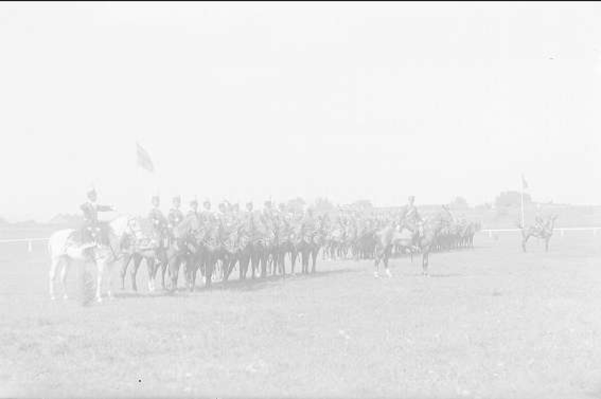 Titel: Kadrilj vid SFK:s vårtävlingar 1934 under ledning av löjtn. C J Wachtmeister. Deltagare musikkåren under musikfanj. C A Borgmans ledning samt 16 underbefäl vid regementet. Bilderna tagna delvis på kaserngården och delvis på prishoppningsbanan.