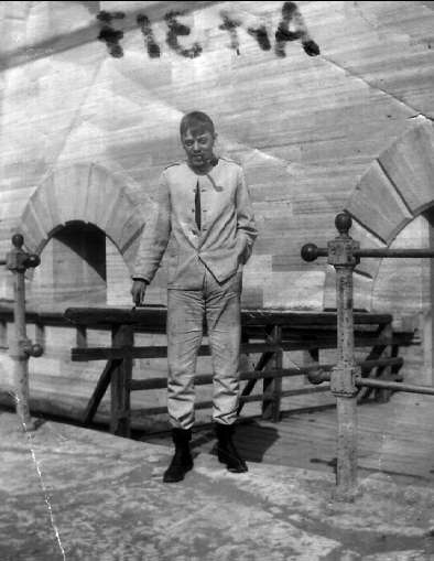 Fästningen. Soldat artilleriet, i grötkostym, omkring 1905. "efter måltiden gjorde vi våra matbestick rena genom att köra dem ner i sanden". I bakgrunden, del av slutvärnet.