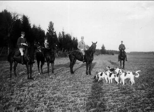 Master och pikörer med ridskolans "Meute" före jaktrittens början. Strömsholm 1910-11.